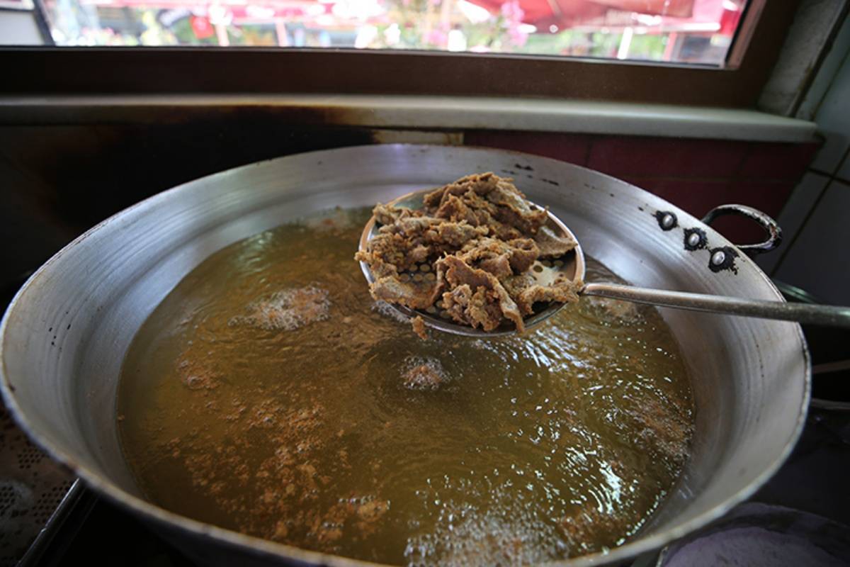 - Kesilen ciğerler, tuz eklenmeden yalnızca özel bir un karışımına hafifçe bulanır; böylece kızarırken hem kıtır bir doku oluşur hem de ciğerin kurumadan pişmesi sağlanır.