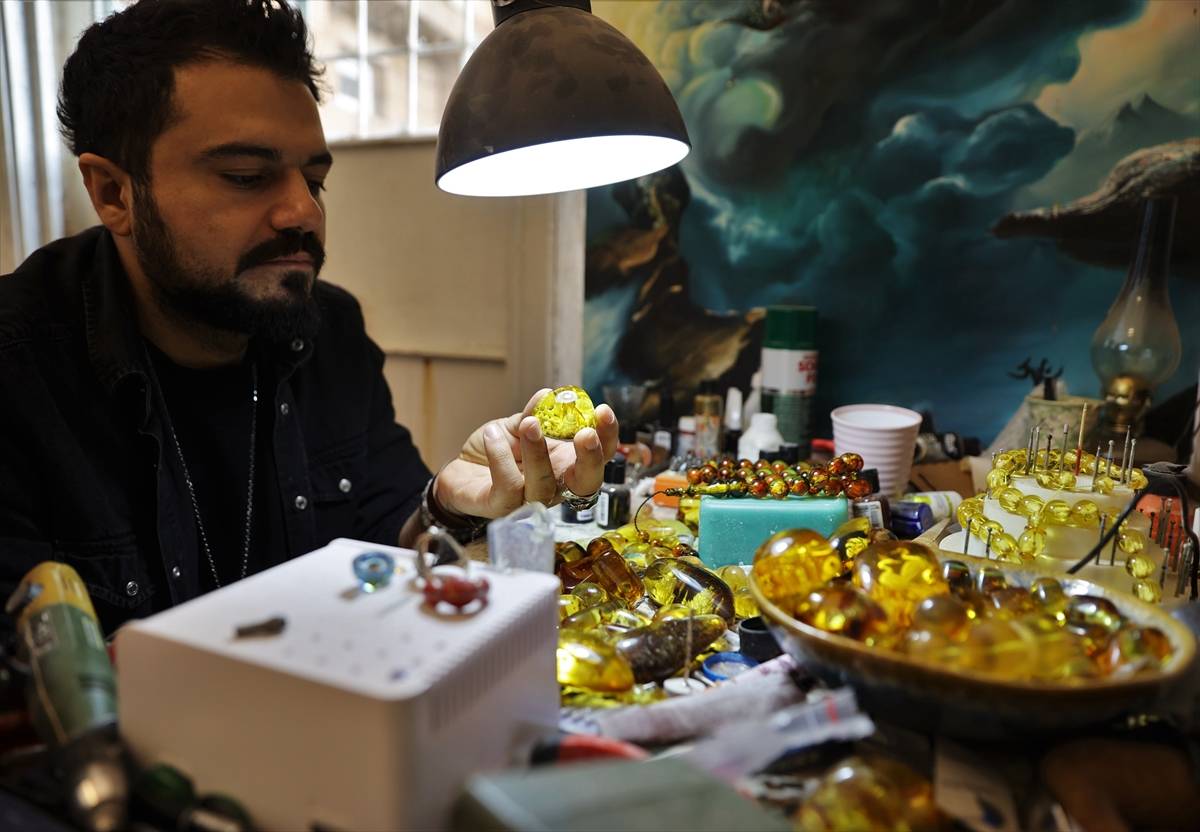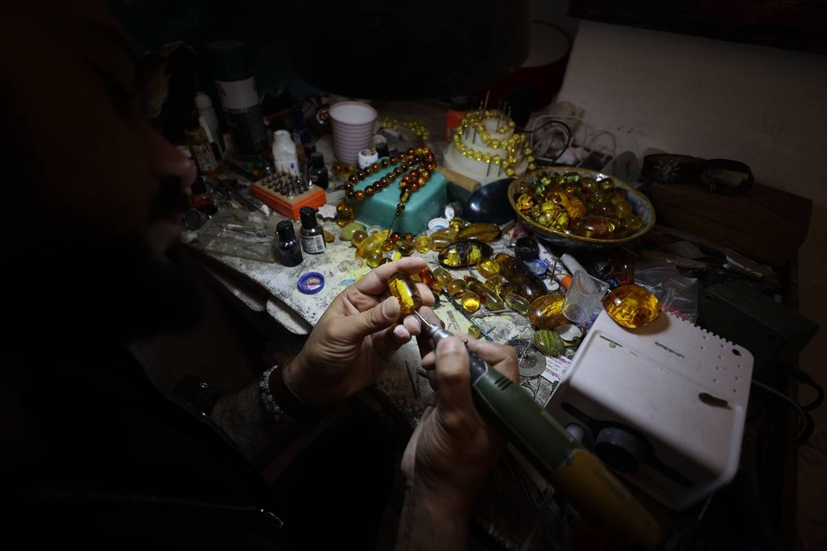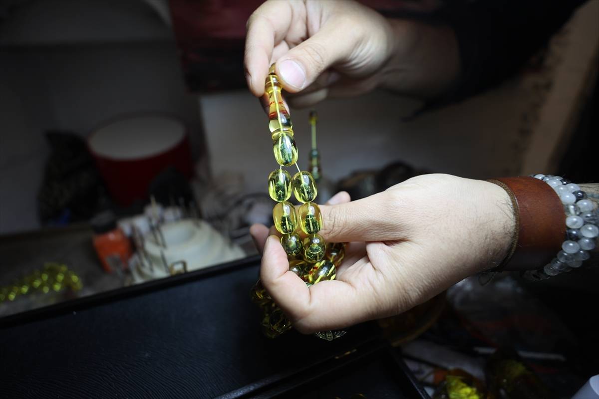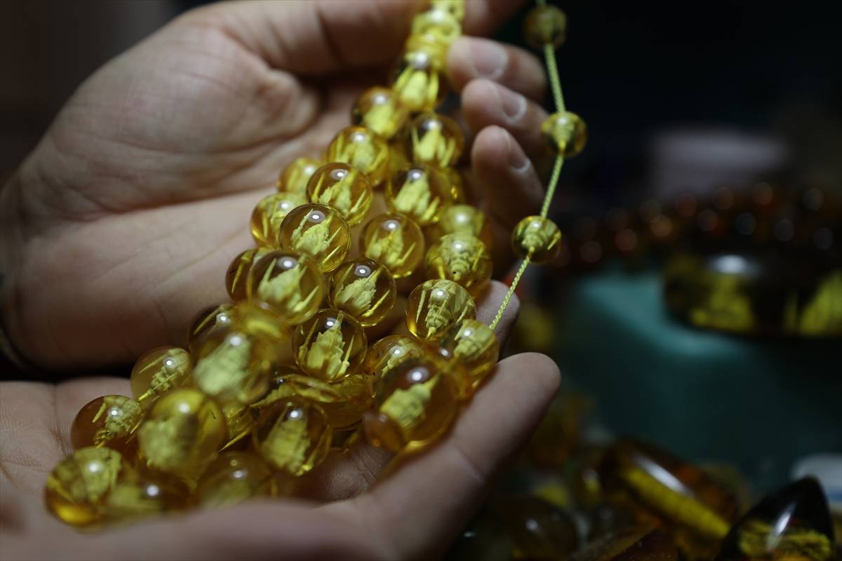 “Çünkü büyük yapılar ve kullandığım malzeme de kristal, çoğunlukla kehribar taşları kullanıyorum. Çok narin taşlar. Kırılgandır. İlk başlarda bayağı bir kırdığım, döktüğüm oldu ama zamanla ustalaştım. Şu anda neredeyse hiç fire vermeden yapıyorum. Kehribar taşının oluşumu milyonlarca yıl sürüyor. Yaklaşık 30-40 milyon yılda oluşan bir süreç bu. Çam ağacının reçinelerinden toprağa oradan fosile dönüşen bir süreç. Doğa tarafından mükemmel hale getirilmiş taşların içine biz de bunları işliyoruz. Öncelikle imamelere kentimizin sembolü Mardin Ulu Cami minaresini yapıyorum. Ardından Türkiye’deki en iyi, en muazzam camileri işlemeye başlıyorum ama her habbesinde farklı camiler oluyor. Böylece 33 taneyi tamamlayınca tespihimiz bitiyor. Çok zorlandığım taraflar da var. Her camide olduğu gibi kendi mimarisinde nasıl zorluklar varsa ben de yaparken o zorlukları yaşıyorum. İlk kubbeyi mesela oturtmakta zorlanıyorum ama dikkatli uğraşlar sonucu bir şekilde yapabiliyorum.”