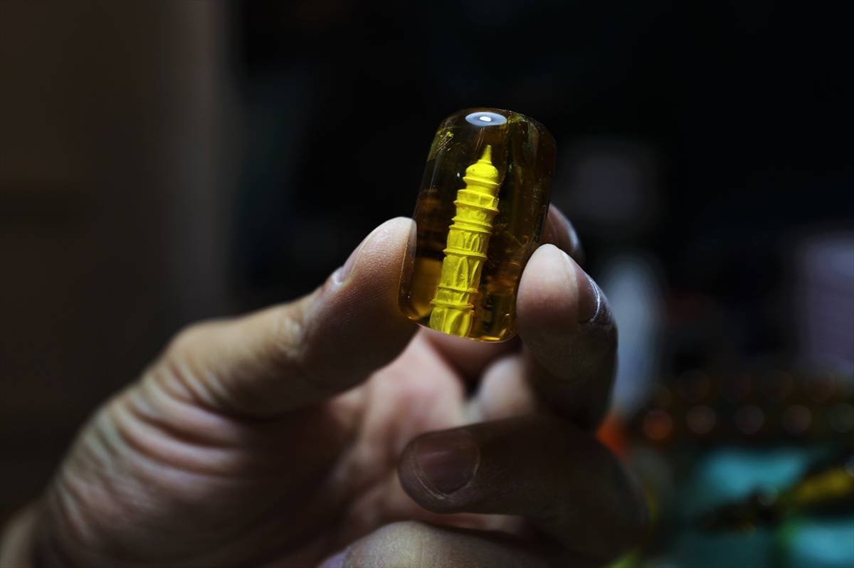 Minyatür sanatçısı Seyfettin Çelik, Türkiye’nin sembol camilerini negatif oyma yöntemiyle (bir yüzeyde tasarımın kendisini değil, arka planı oyarak desenin ön plana çıkarılması) tespih tanelerinin içine işliyor.