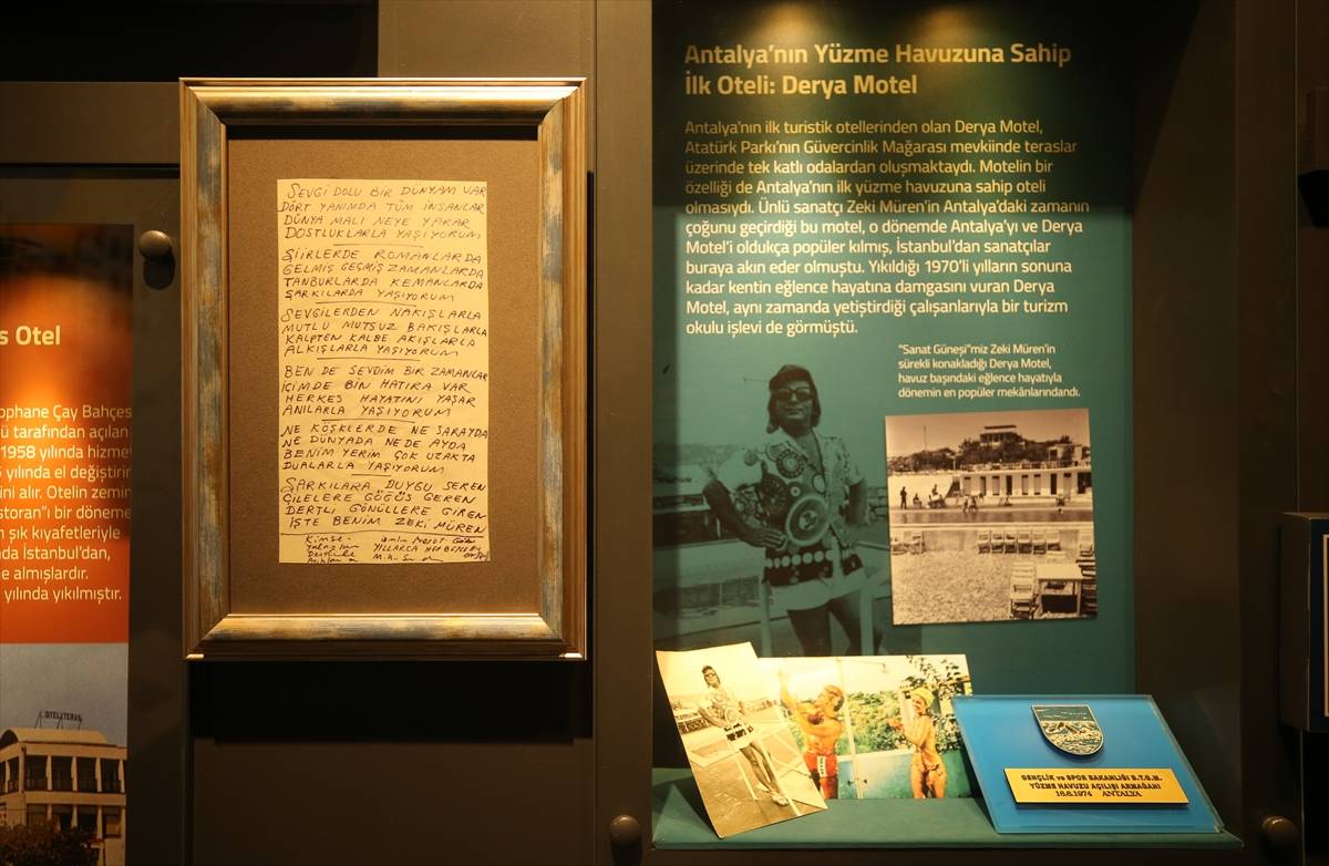 Müren’in sık sık Antalya’yı ziyaret ettiğini ve bir otelde kaldığını anlatan Kocagöz, “Antalya’da birçok şarkının sözlerini yazmış. Otelde kaldığı zaman gözlüğünü o zamanlar çocuk olan otelcinin kızı Handan Şahin’e hediye etmiş. Yıllarca saklanan bu gözlük, müzemiz açıldığında bağışlanmış. Uzun zamandır müzemizde sergileniyor. Yine otelde ‘Ben Zeki Müren’ isimli şarkısını sözlerini yazdığı kağıdında orijinali müzemizde sergileniyor.” diye konuştu.