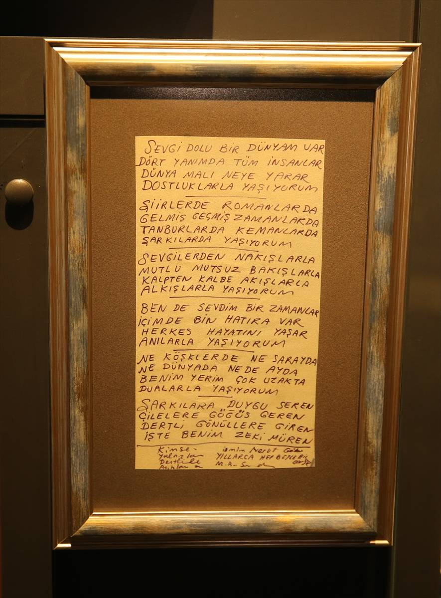 Kepez Belediyesi’nin Dokuma Park’taki “Bir Zamanlar Antalya Müzesi”nde sergilenen Zeki Müren’in gözlüğü ile el yazısıyla kaleme aldığı şarkının sözleri ziyaretçilerin ilgisini çekiyor.